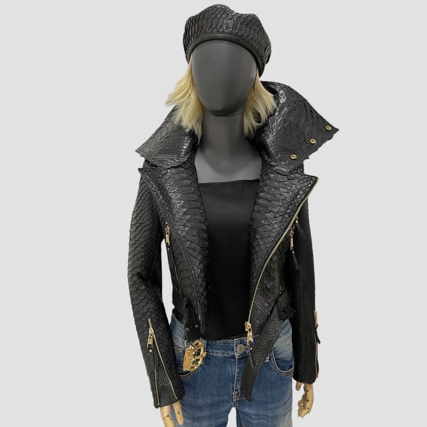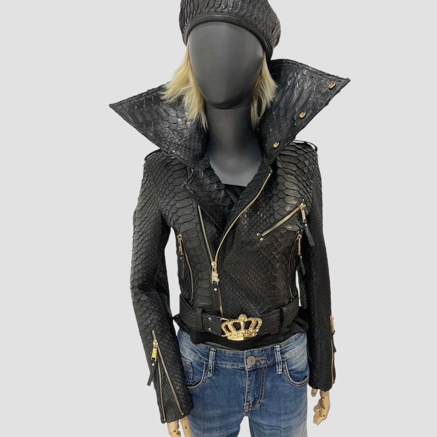Crafted from rare KING python leather, this jacket features the largest scales of any python leather, enhancing its luxurious and exclusive appeal.