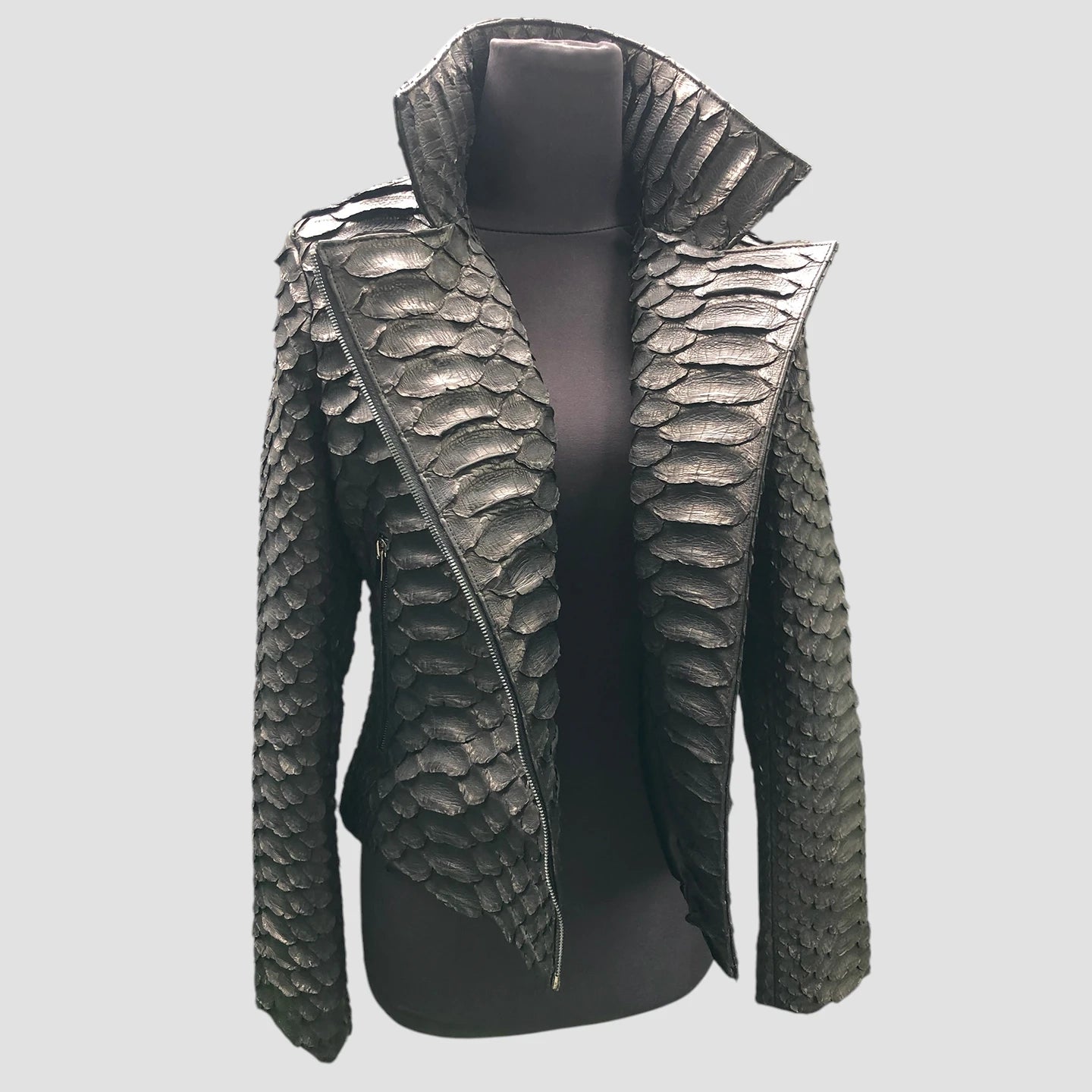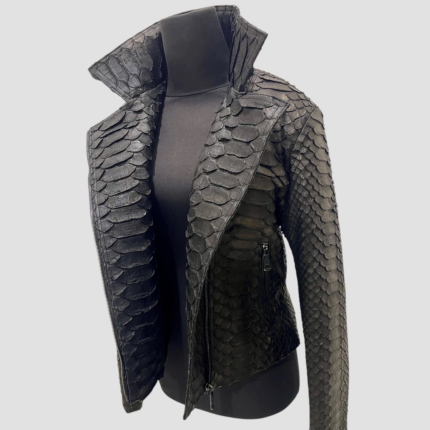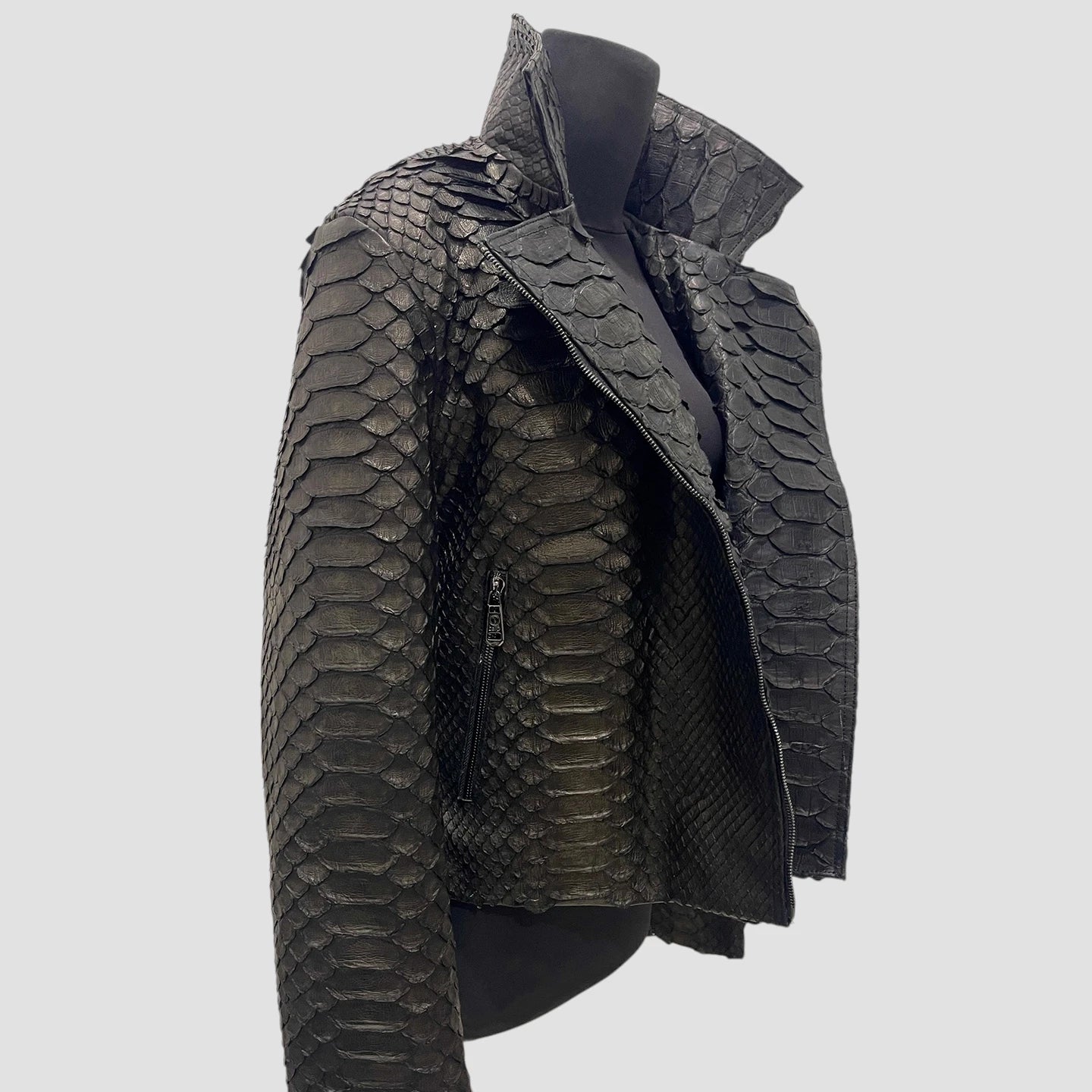 Crafted from rare KING python leather, this jacket features the largest scales of any python leather, enhancing its luxurious and exclusive appeal.