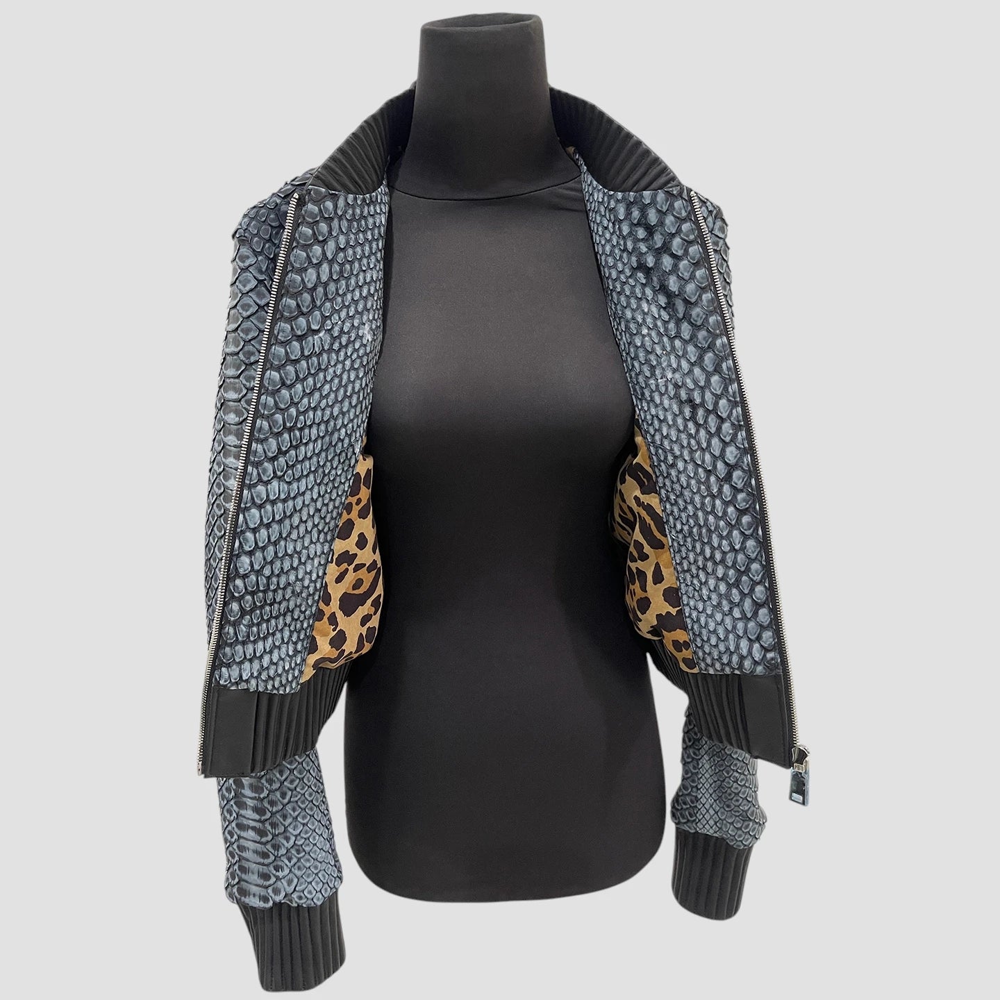 Crafted from rare KING python leather, this jacket features the largest scales of any python leather, enhancing its luxurious and exclusive appeal.
