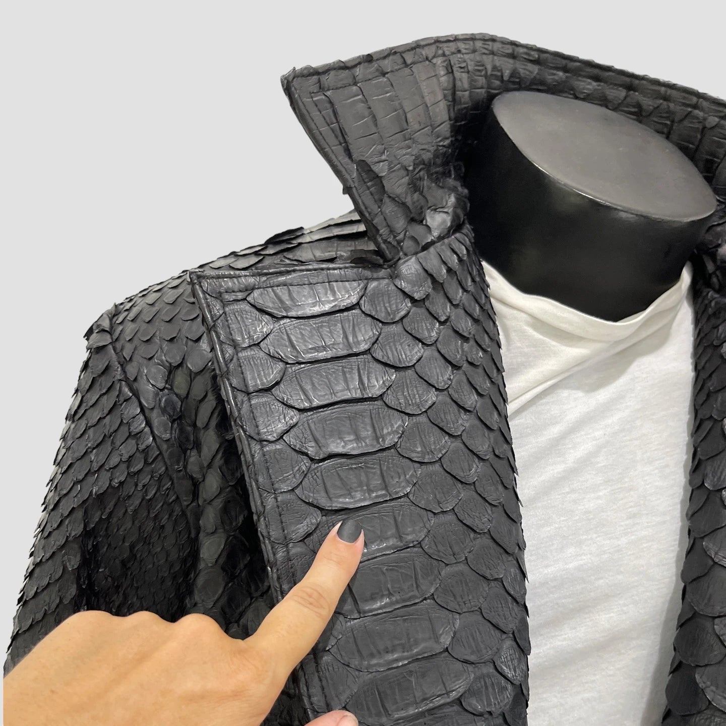 Crafted from rare KING python leather, this jacket features the largest scales of any python leather, enhancing its luxurious and exclusive appeal.