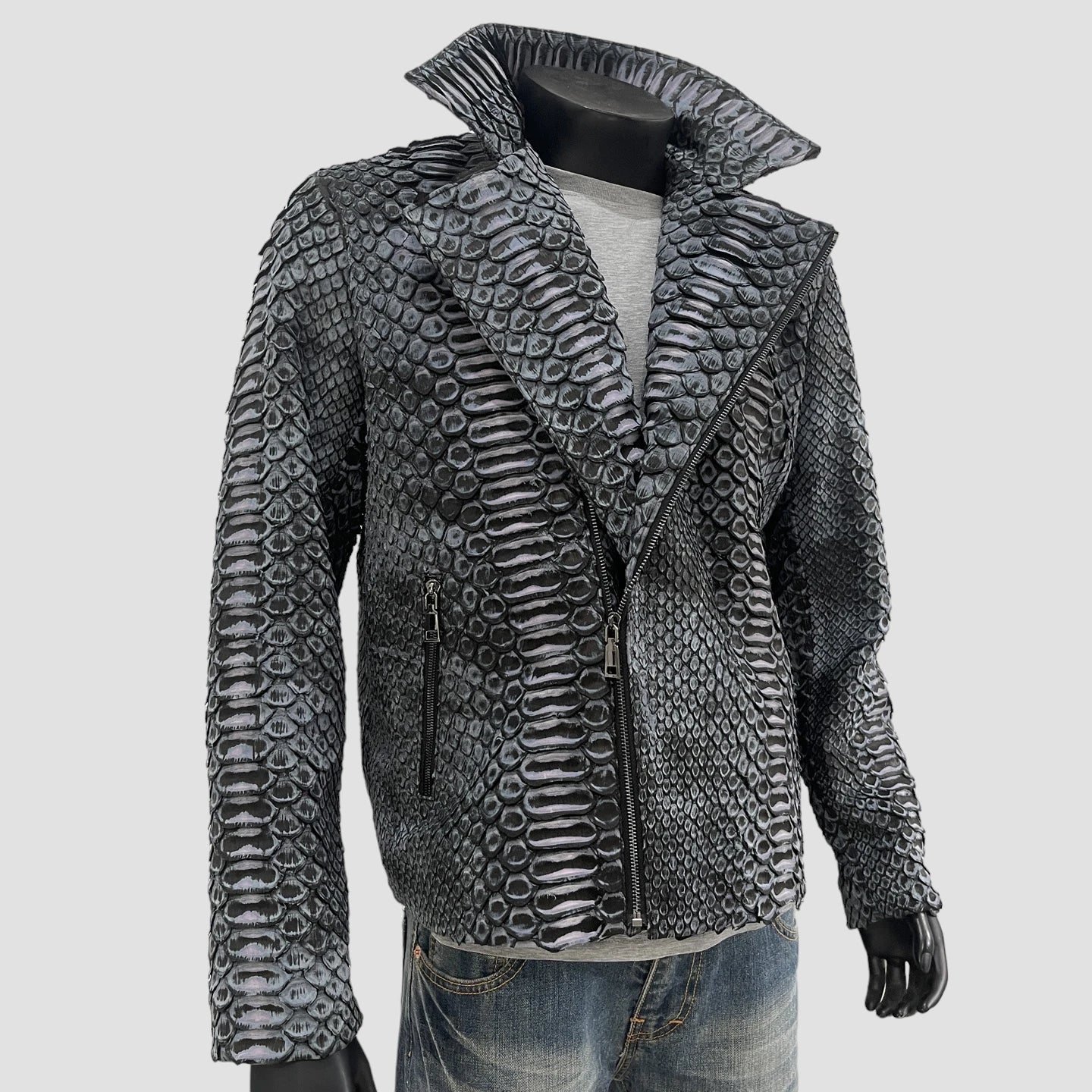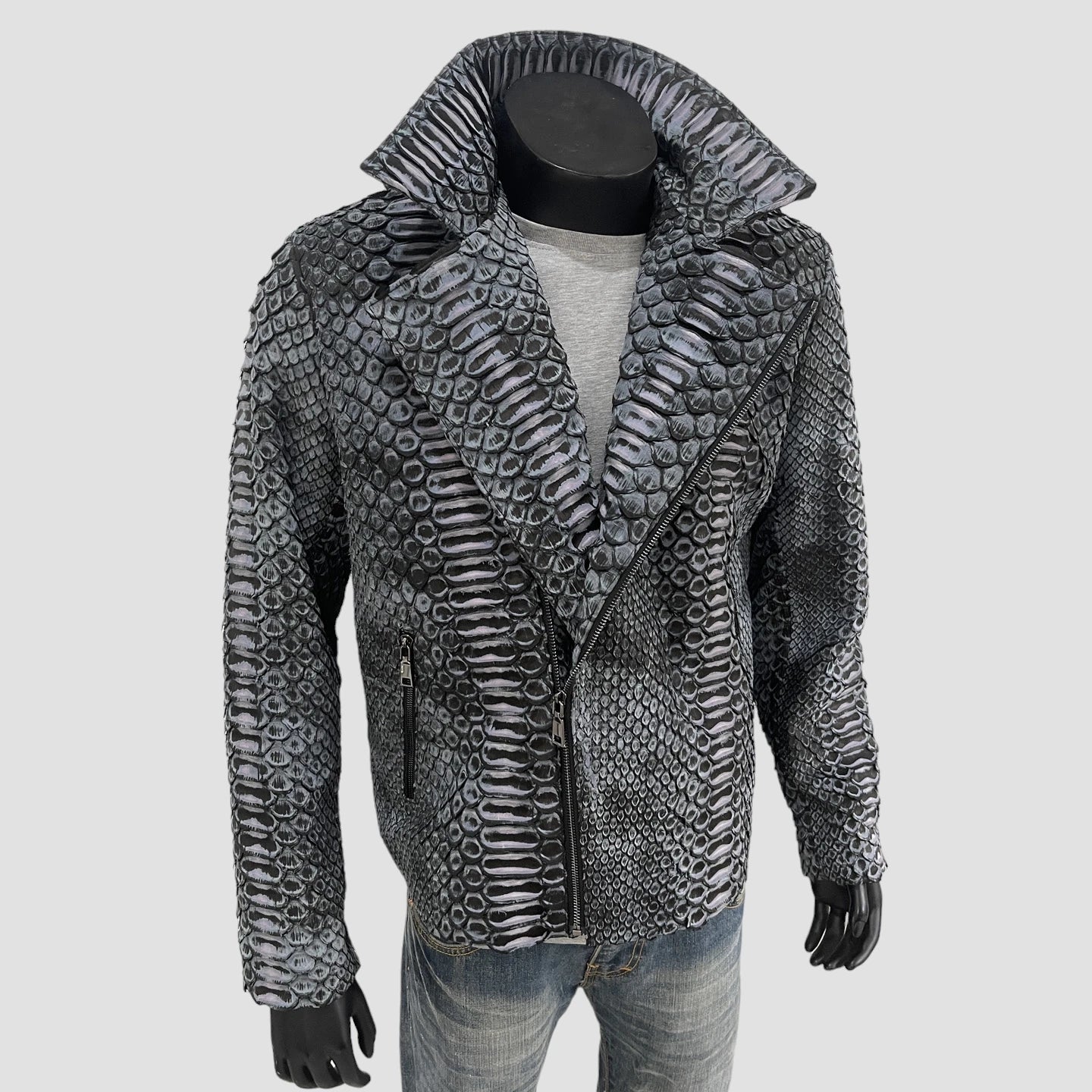 Crafted from rare KING python leather, this jacket features the largest scales of any python leather, enhancing its luxurious and exclusive appeal.