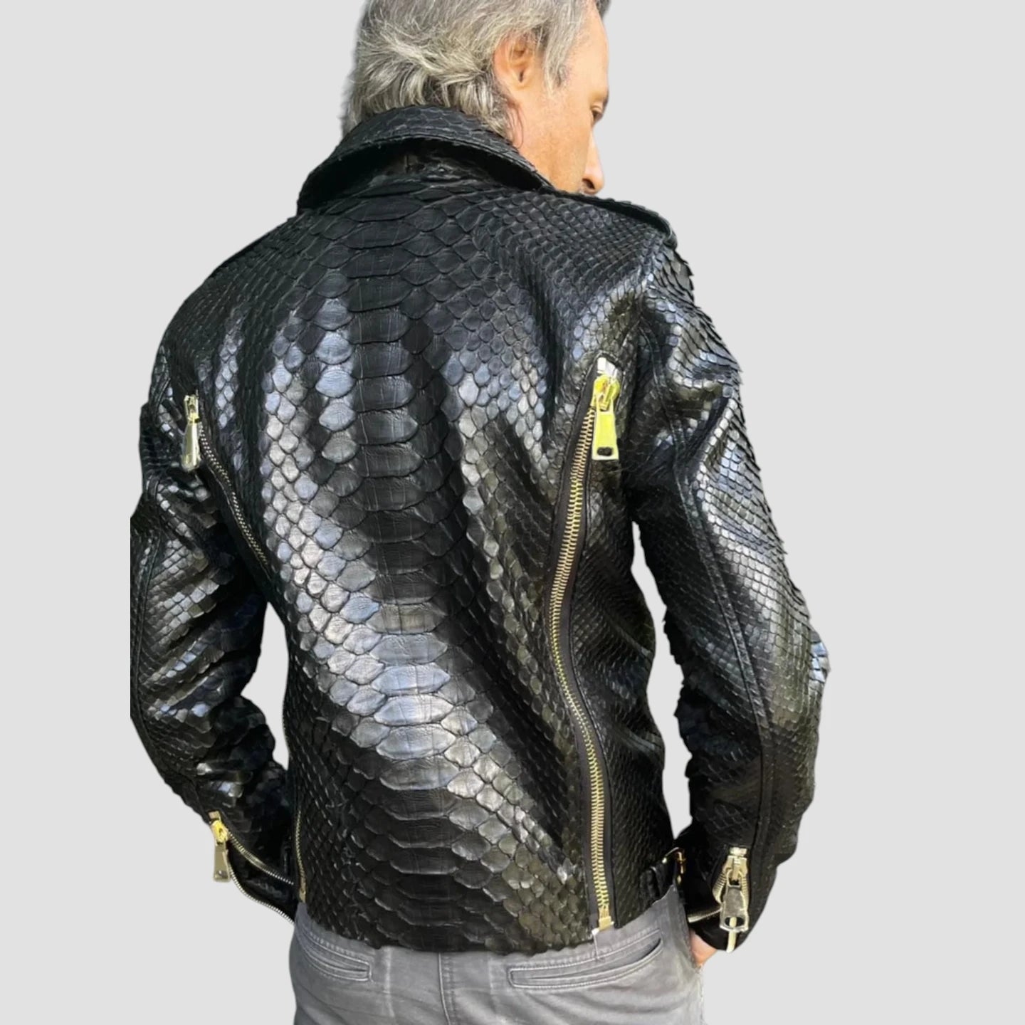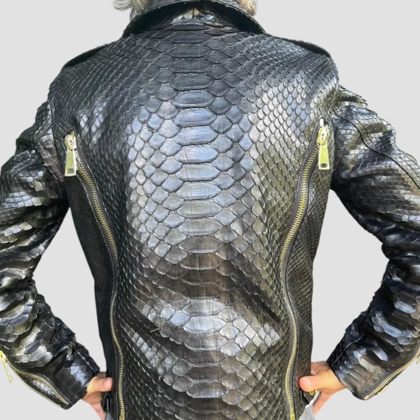 Crafted from rare KING python leather, this jacket features the largest scales of any python leather, enhancing its luxurious and exclusive appeal.